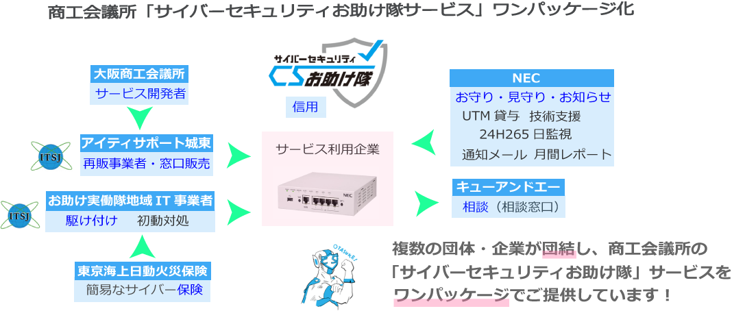 「サイバーセキュリティお助け隊サービス基準」を満たすサービスとして国に登録されたことにより 本サービスの開発者である大阪商工会議所は、IPAより「サイバーセキュリティお助け隊」マークの利用許諾を得ており、 大阪商工会議所の契約先再販事業者であるアイティサポート城東もこのマークを利用させていただいております。 |